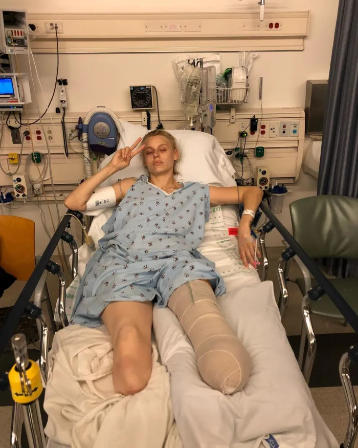 Lauren Wasser laying in a hospital bed after having her legs amputated, Photo Credit: theimpossiblemuse/Instagram